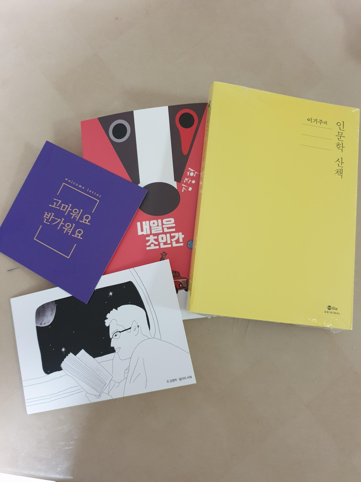웰컴엽서 같은 것과, '김중혁의 내일은 초인간' 책, '이기주의 인문학 산책' 책, 그리고 필사 북?? 뭘 베껴 쓰라는 것 같은
