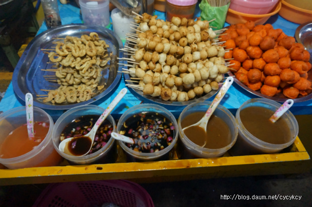 이곳은 닭 내장을 꼬치로 판다. 그리고 어묵 꼬치, 이렇게 앞에 준비된 많은 소스들 중 취향껏 골라 찍어 먹었다.