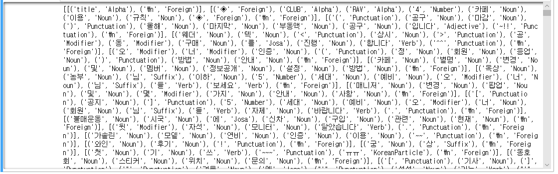 읽은 파일을 konlpy Twitter를 통해서 단어 분석을 합니다.