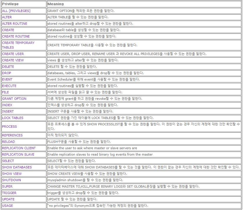 mariadb에서 부여 및 관리 할 수 있는 권한 목록을 정리 해 둡니다.