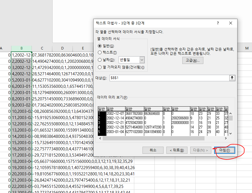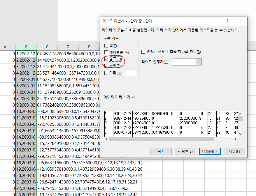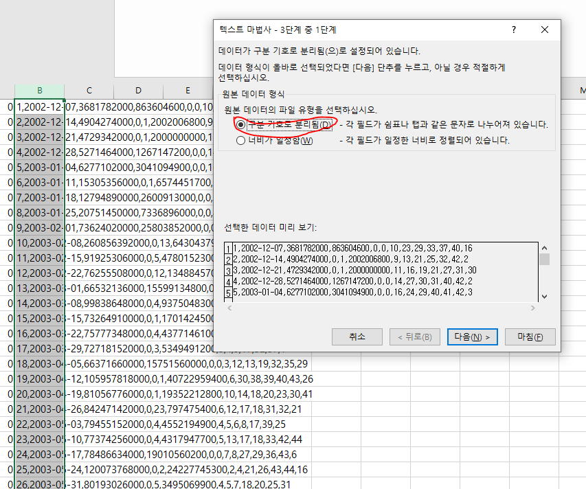 구분기호는 지금 여기 데이터는 ',' 콤마로 되어 있지만, 혹시나 다른걸로 되어 있다면 그 기호를 아래 기타에 체크하시고 써주시면 됩니다.