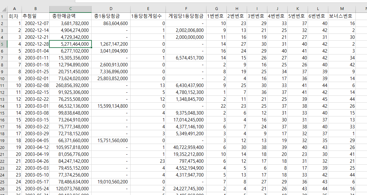 '회차','추첨일','총판매금액','총1등당첨금','1등당첨게임수','게임당1등당첨금','1번번호','2번번호','3번번호','4번번호','5번번호','6번번호','보너스번호'