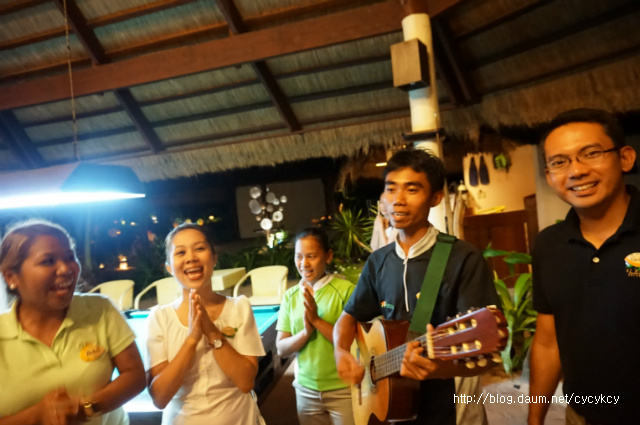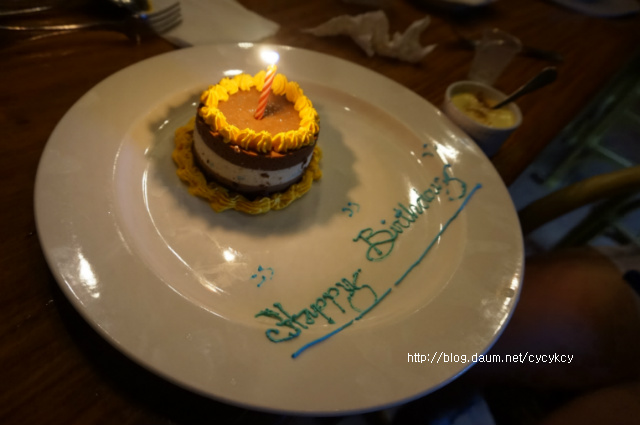 리조트에서 생일 축하 이벤트를 열어 준다고 한다. 정말... 작은 케잌과 함께 리조트 직원 5명이 와서 기타를 치며 노래를 불러준다. 이 또한 낭만이 아니겠는가? 5천 km 떨어진 이국에서 즉석 라이브 생일 축하공연 이라니!
