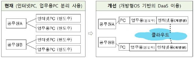 공공기관 PC에는 실제 업무에 필요한 자료와 SW가 설치되어 있고, 외부망이 차단된 업무망 PC와 자료저장 않는 인터넷망 PC를 각각 사용중 이며, 사용자는 클라우드에서 실행되는 가상의 PC에 원격 접속하여 이용하고 있다.