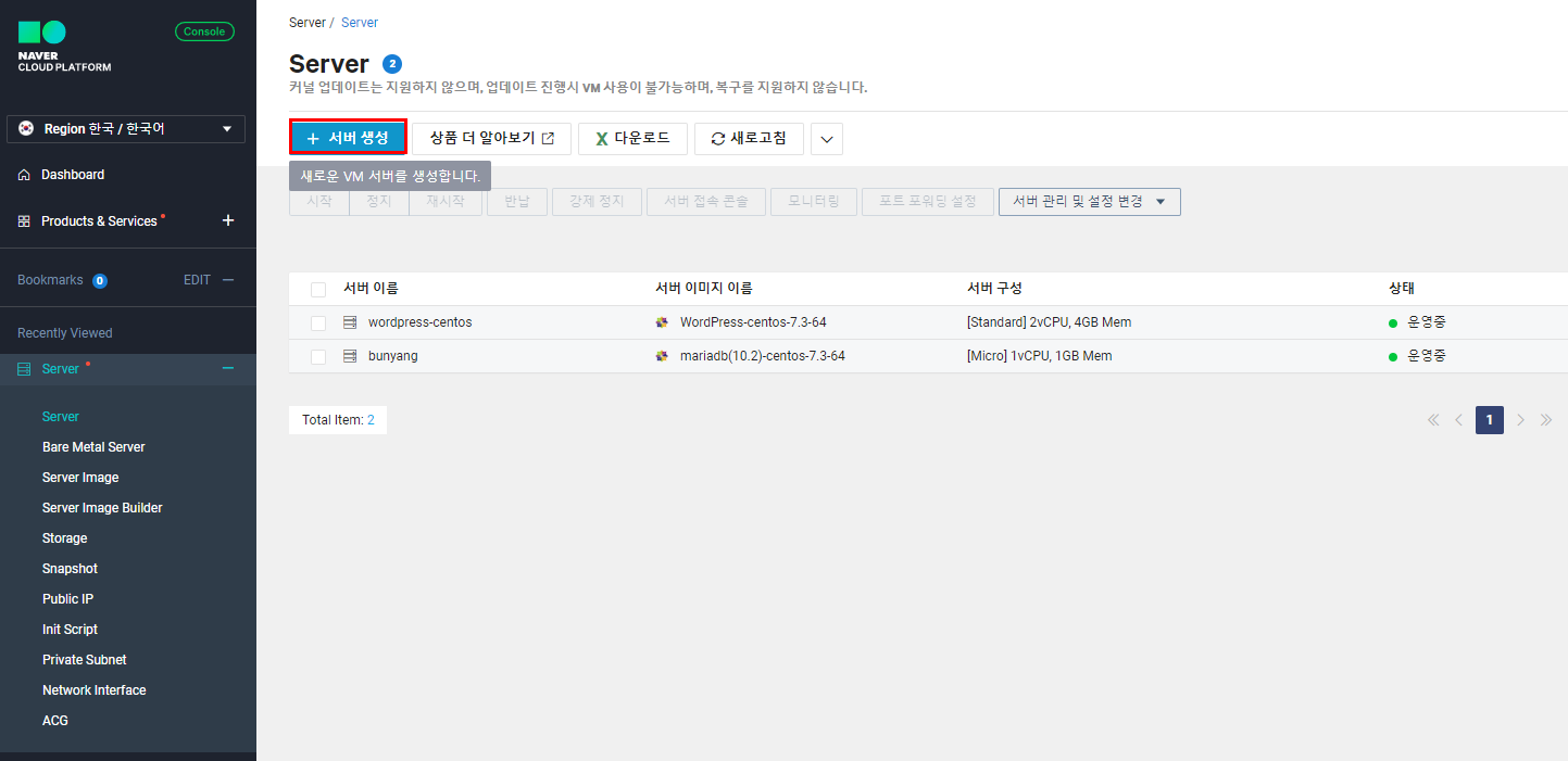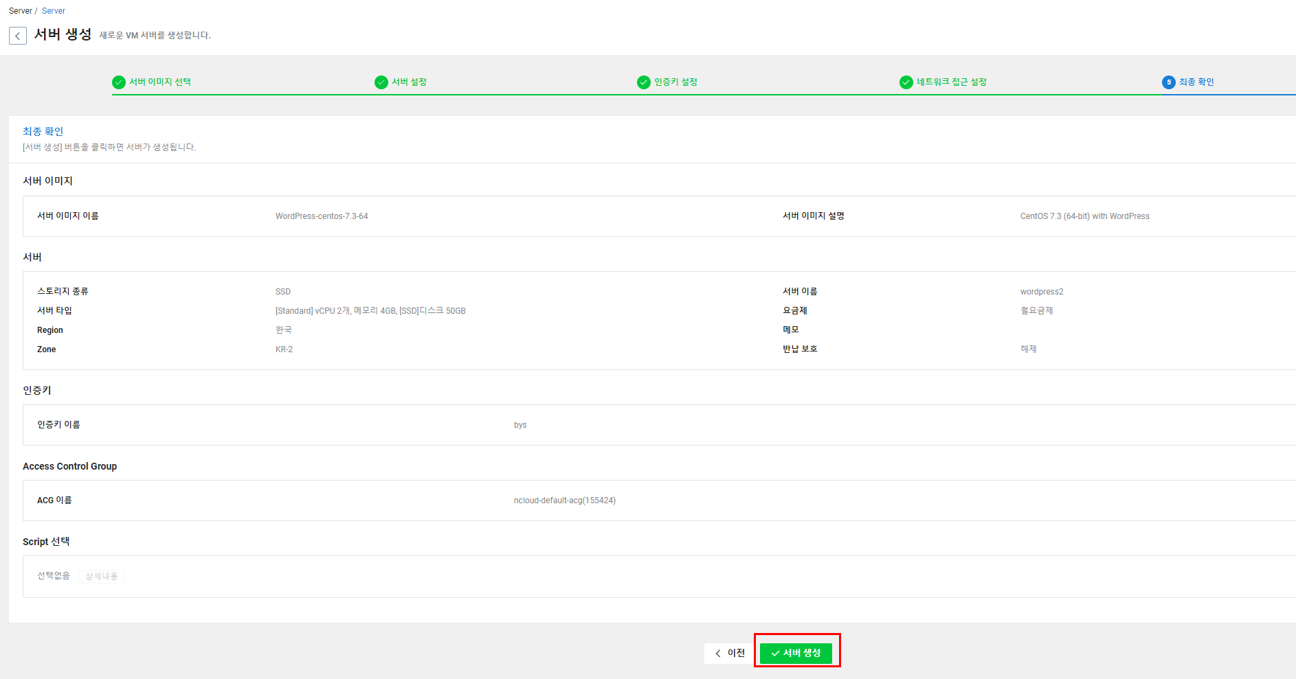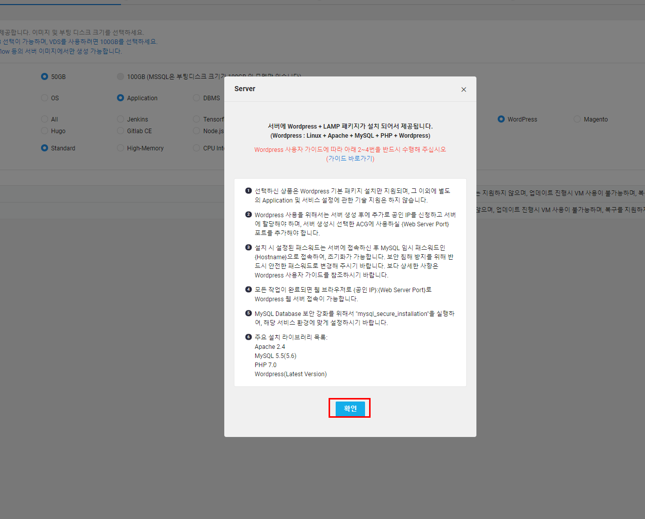 네이버 클라우드 플랫폼에서는 wordpress 설치와 함께 LAMP를 한번에 설치를 다 해서 서버를 켜줍니다.