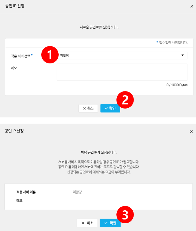 콘솔 창에서 공인IP 신청 버튼을 꾹 눌러 줍니다.
