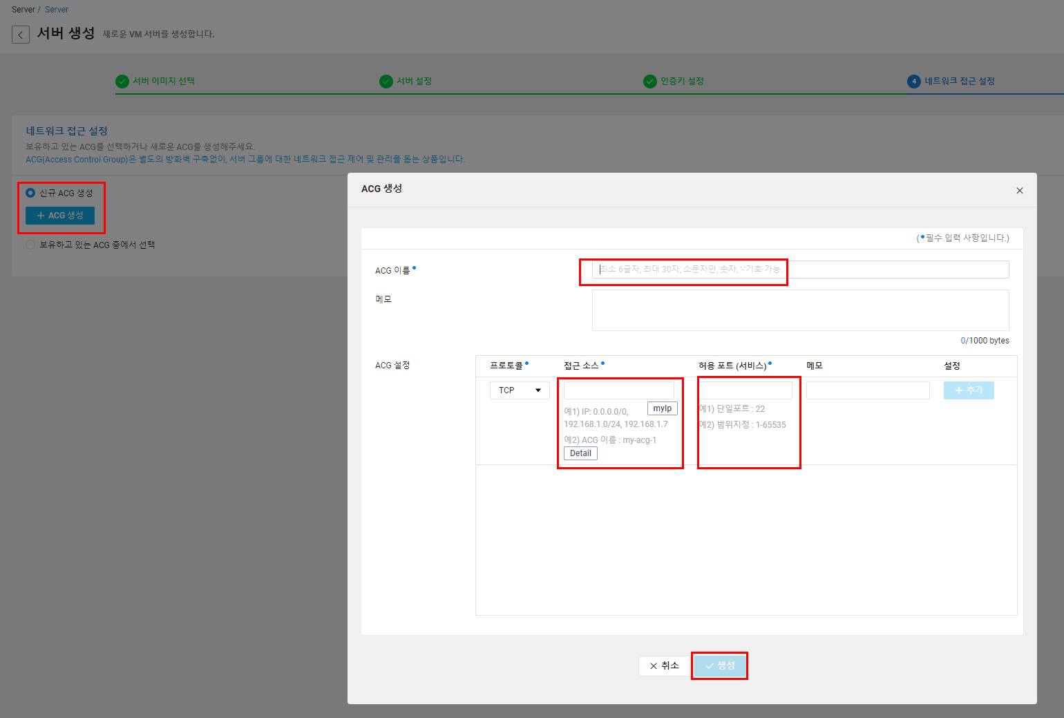 ACG는 뭐 쉽게 방화벽입니다. 모두 허용 하실꺼면 0.0.0.0/0 입력하시고 허용 모드에 1-65535 를 입력 합니다.