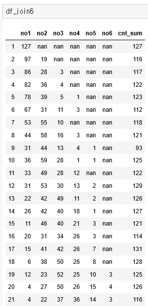 이렇게 df1을 가지고 df1_cnt를 만들어줍니다. 그렇게 6개의 데이터셋을 모두 처리 해줍니다.