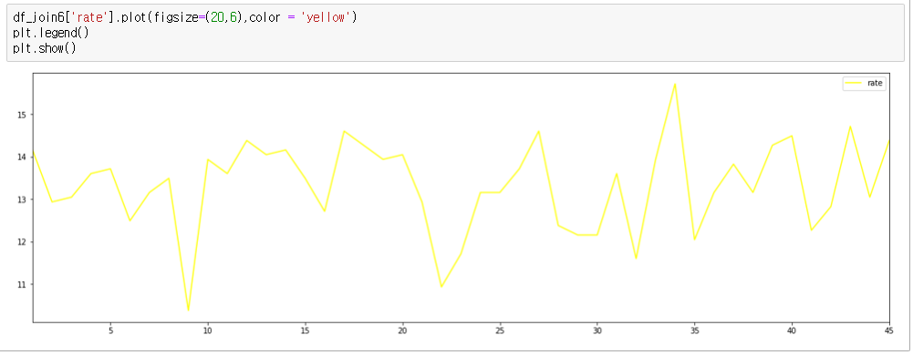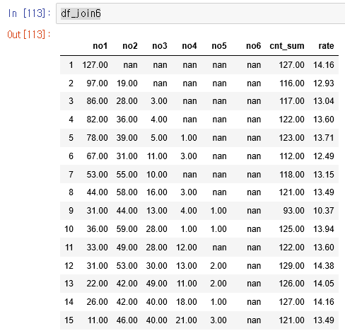 그럼 1회당 어떤 번호가 당첨번호로 나올 확률도 구해 볼까요? rate라는 컬럼을 하나 더 만들어서 확률을 구해 넣어 보겠습니다.