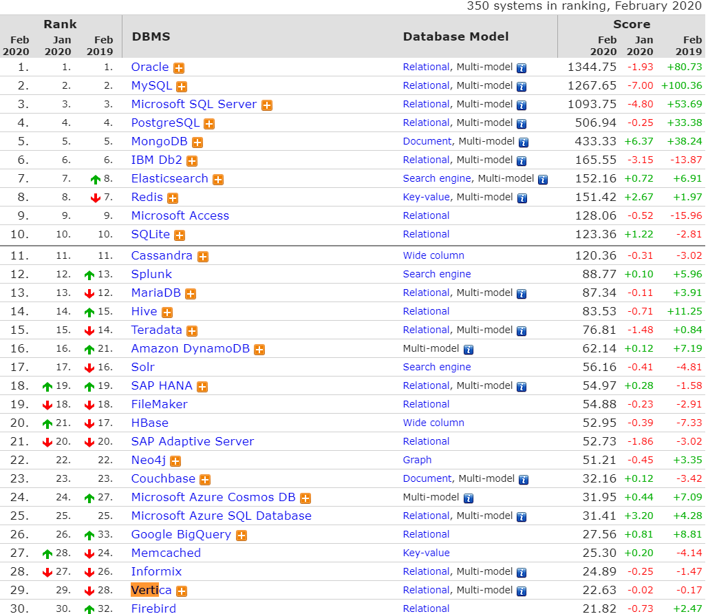 The DB-Engines Ranking is a list of database management systems ranked by their current popularity. We measure the popularity of a system by using the following parameters: