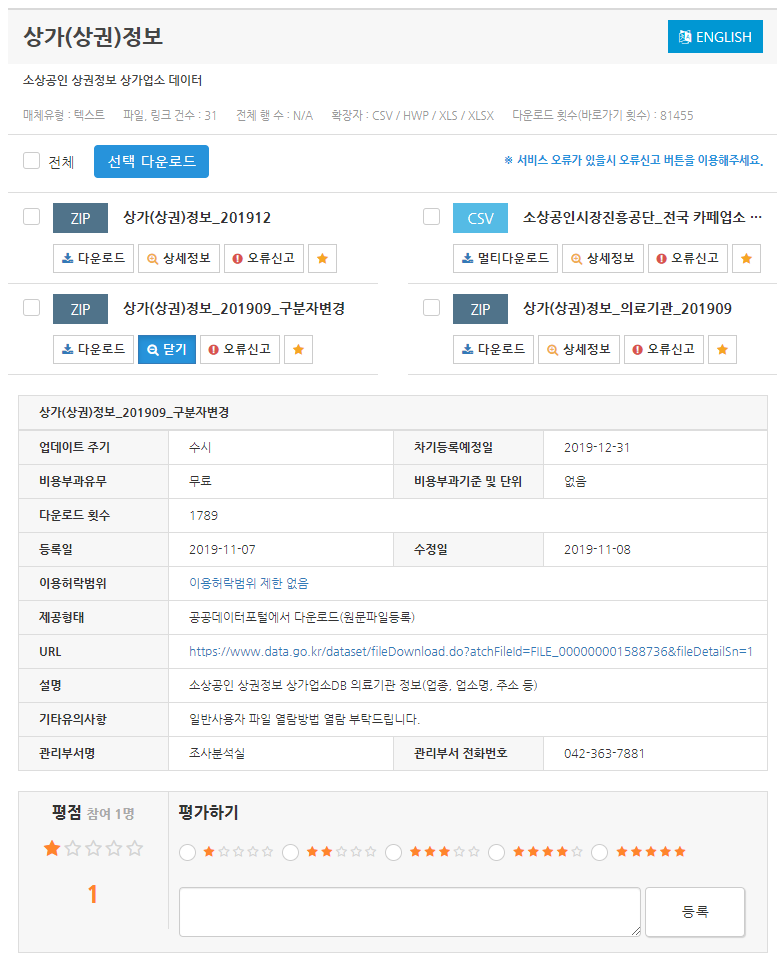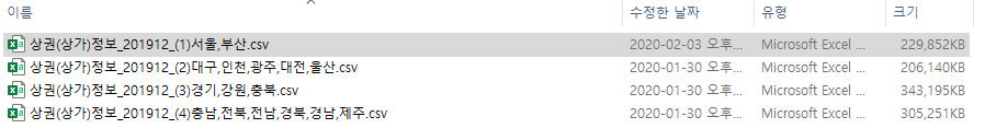 여기서 데이터를 다운로드하시면 "상가(상권) 정보_201912.zip" 파일을 받게 되십니다.
