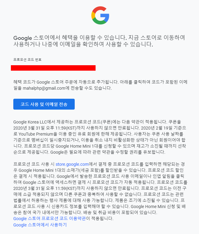 <코드 사용 및 이메일 전송> 버튼을 클릭하시면 바로 google 스토어에 연결되고요.