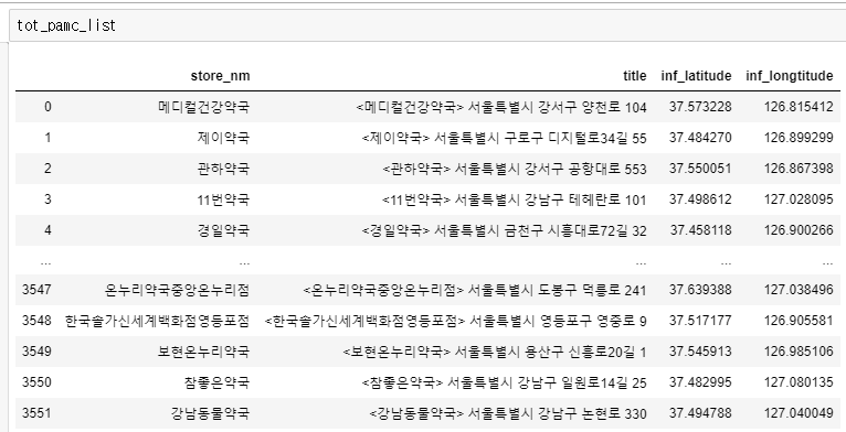 약국 이름과 주소가 잘 나오고 있는 걸 확인할 수 있습니다.