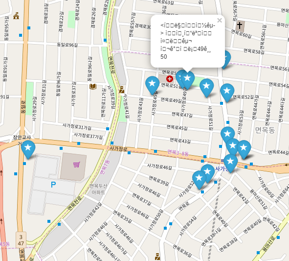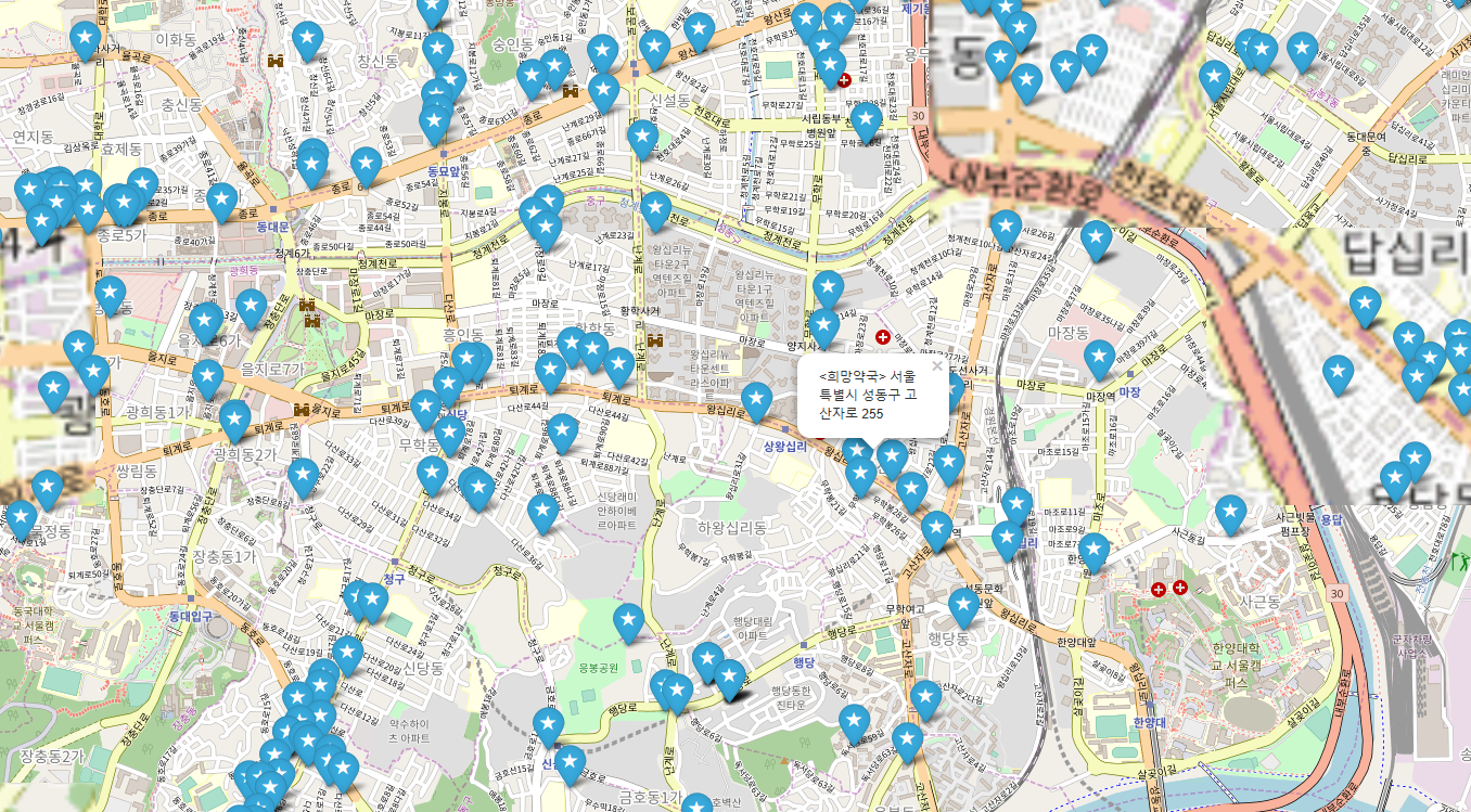 일단 서울시내 모든 약국의 데이터를 가지고 와서 예전에 제가 만들었던 주소 DB와 조인하여 해당 주소의 위경도 값을 가지고 온 뒤, 그 값을 통해서 지도 위에 약국별로 마크를 하고, 주소까지 popup으로 띄워 보겠습니다.