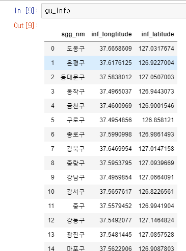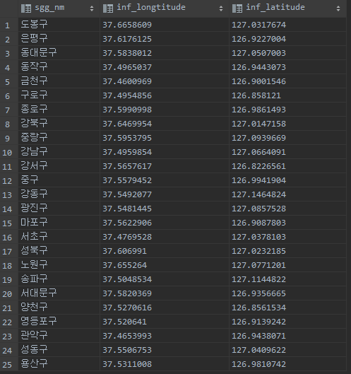 그리고 다음은 지도 위에 시각화를 위해서 각 서울시 각 구 의 중심 위치의 위경도 데이터를 가지고 옵니다. 전 미리 데이터를 다운로드하여서 DB에 넣어 뒀습니다.