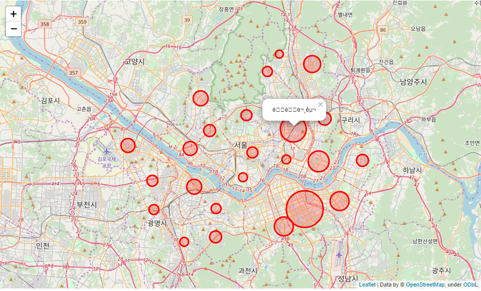 이렇게 하면 위 그림과 같이 지도 위에 그림이 그려지고 각 구별로 원이 생깁니다. 물론 원이 클수록 해당 구에 약국이 많이 있다는 의미가 됩니다. 그냥 봐도 강남 쪽에 약국이 많이 있습니다.
