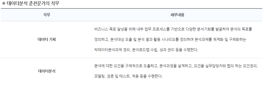 데이터분석 준전문가란 데이터 이해에 대한 기본지식을 바탕으로 데이터분석 기획 및 데이터분석 등의 직무를 수행하는 실무자를 말한다.