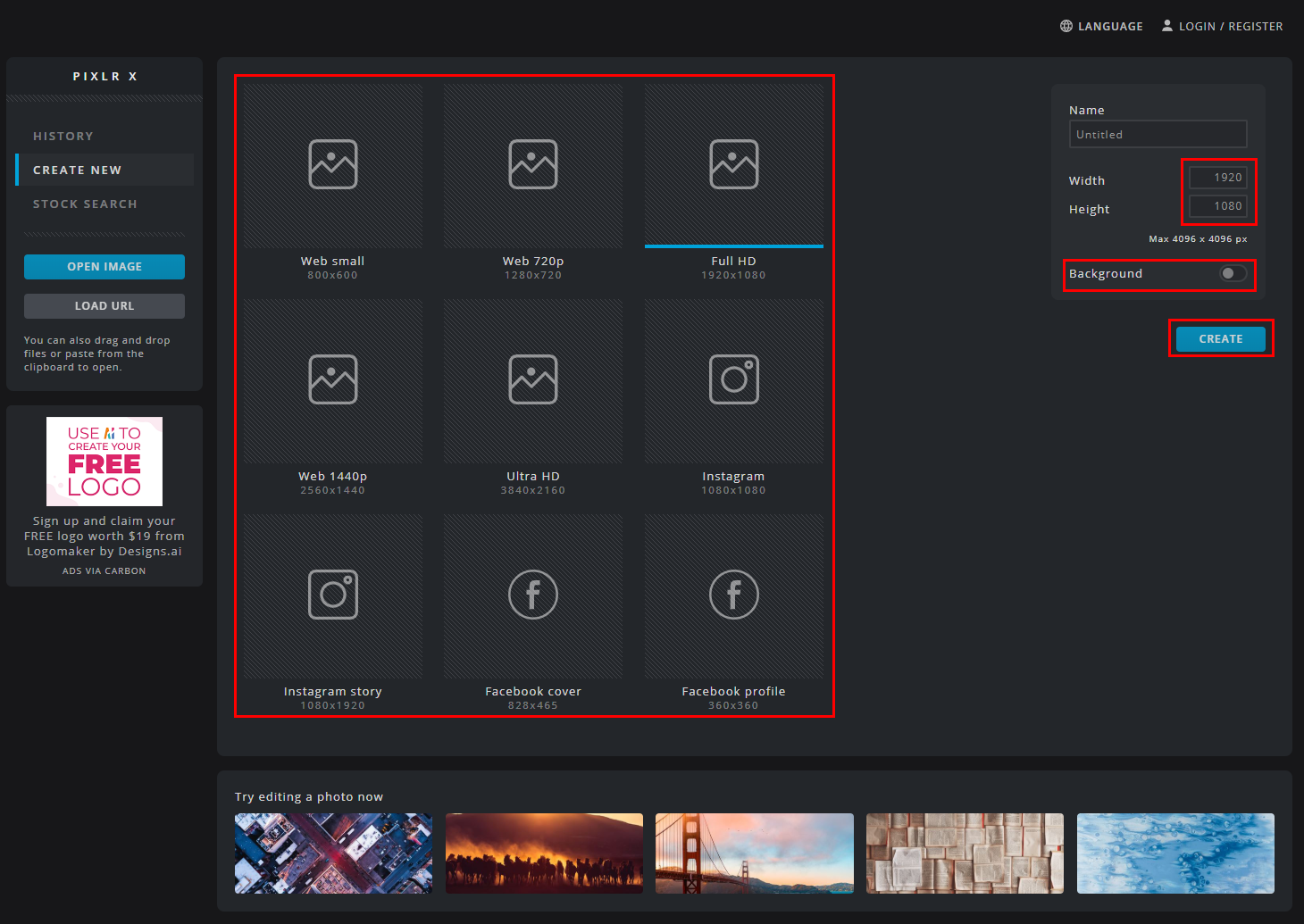 아래 보이는 Background 스위치 버튼은 배경을 지정하는 겁니다. 혹시나 배경색이 없는 png 타입의 그림을 그리고 싶으신 분들은 저대로 CREATE 버튼을 눌러주시면 되고, 그게 아니면 스위치 버튼을 활성화시켜서 배경색을 지정하시어 그림을 시작하셔도 됩니다.