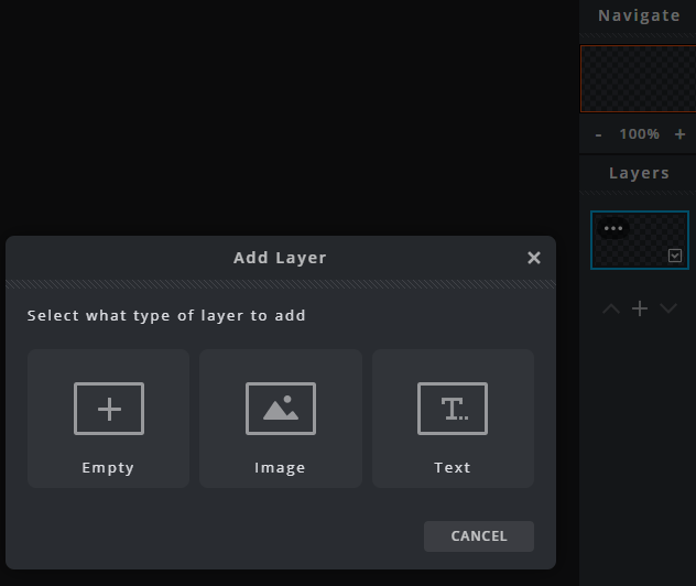 위 그림은 제가 Layers에서 + 버튼을 눌렀을 때의 화면입니다. Layer를 추가할 때 빈 Layer가 생기게 할 수도 있고, 이미지나 텍스트로 Layer를 생성할 수도 있습니다.