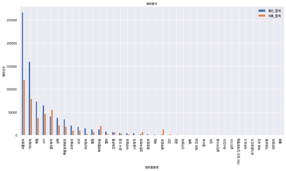 ax=crime_m.sort_values(by='혼인_합계', ascending=False).plot(kind='bar', title='범죄분석', figsize=(16, 8), legend=True, fontsize=12)