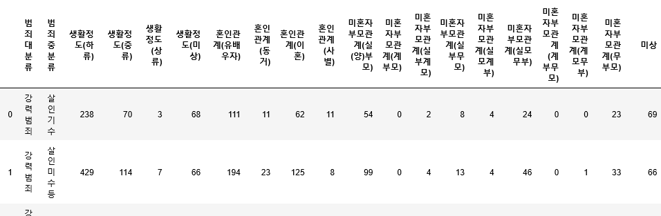 6. 데이터를 직접 보면 각 범죄 카테고리가 row로 있는데, 범죄와 상관없이 생활정도별로 각 범죄별 데이터의 합계를 구해서 따로 DataFrame을 만들어 줍니다.