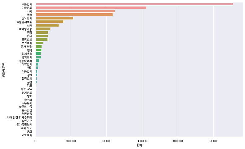crime['합계'] = crime['생활정도(하류)']+crime['생활정도(중류)']+crime['생활정도(상류)']+crime['생활정도(미상)']
