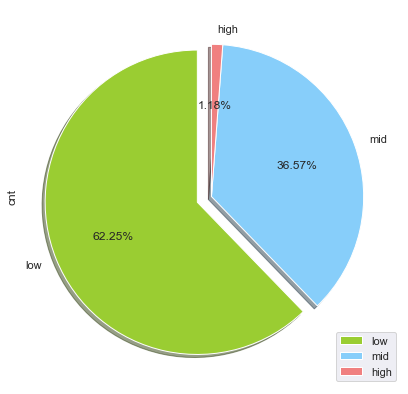 plot = life_level.plot.pie(subplots=True, y='cnt', figsize=(7, 7),shadow=True,startangle=90,explode = group_explodes,colors=group_colors,autopct='%1.2f%%')