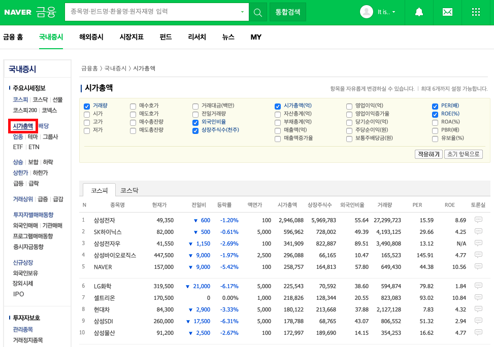 네이버금융 > 국내증시 > 시가총액