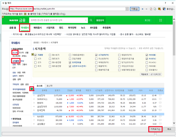 국내증시 > 시가총액 > 코스피 좌측 작은 체크박스 > 우측 하단 가져오기