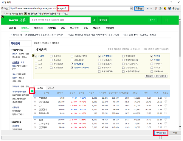 위 그림과 같이 작업을 했습니다. 두번째 시트를 가지고 올때는 위와 같이 주소창에 페이지 번호가 뜨는것을 확인 할 수 있습니다. 네이버 금융의 경우 전체 데이터를 가지고 오기 위해서는 약간의 반복작업을 해줘야 하는 번거로움이 있습니다.