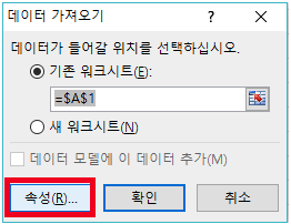 위 그림과 같이 작은 데이터 가져오기 창이 나타나면 좌측 하단의 속성 버튼을 클릭 합니다.