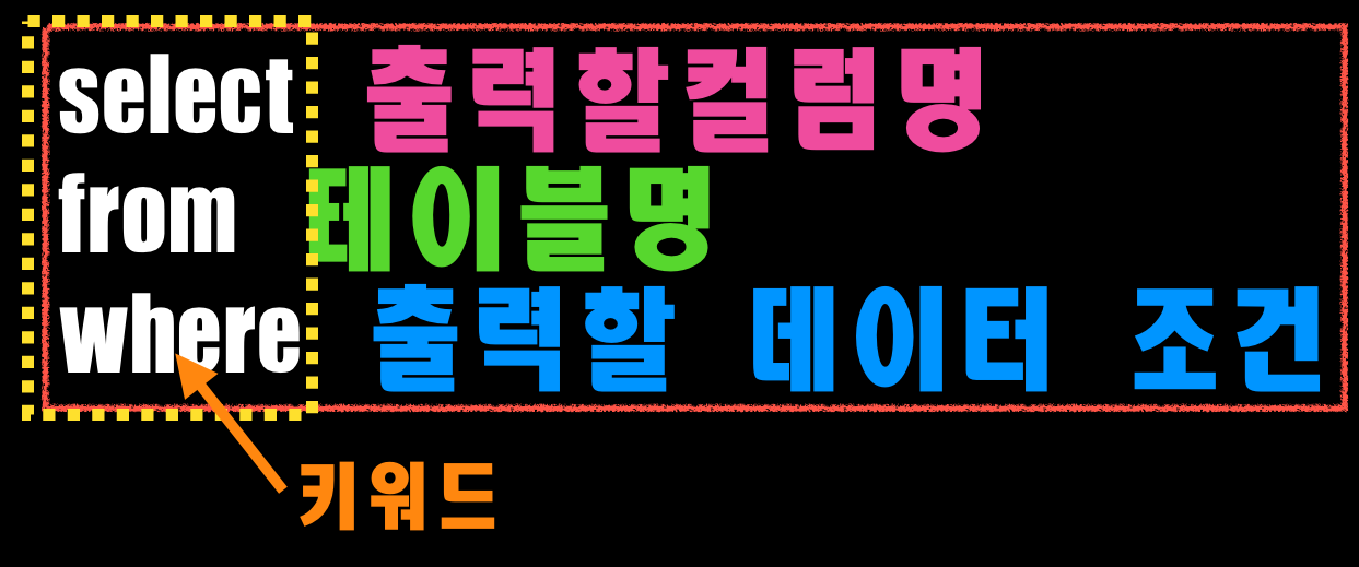 우리는 select, from, where를 키워드라고 부릅니다. 이는 mysql이나 oracle 등의 DBMS에서 미리 정해놓은 단어라는 걸 알고 있으면 됩니다. 위 그림과 같은 모습이 우리가 앞으로 공부할 select 명령어의 가장 기본적인 모습이라 생각하면 됩니다.