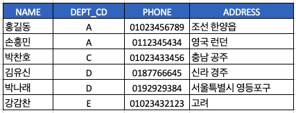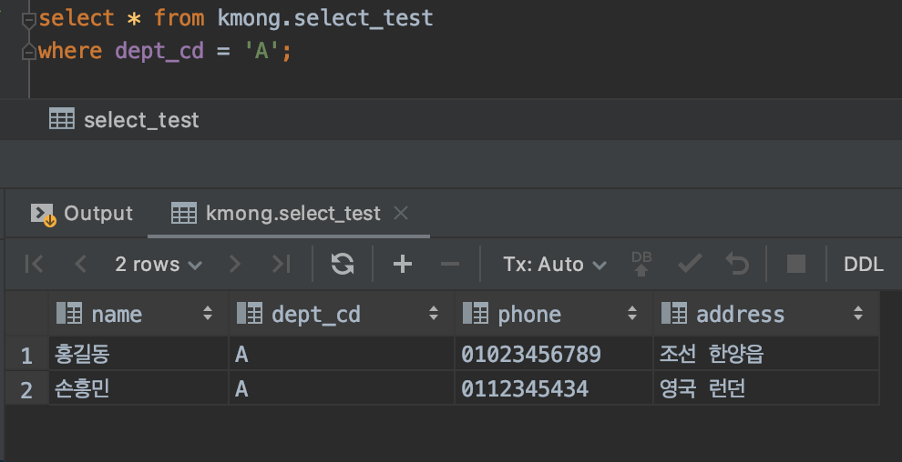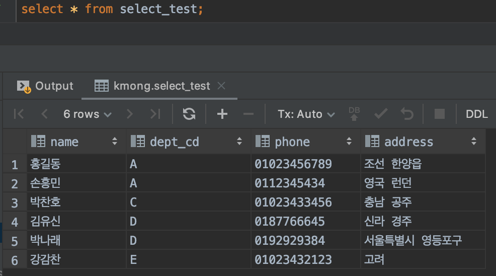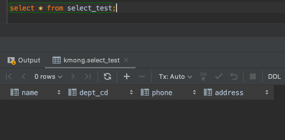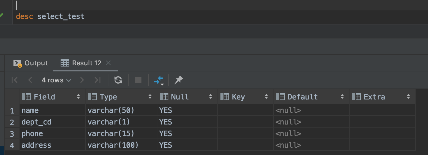 위 그림에서 보면 select_test라는 테이블에는 name, dept_cd, phone, address 이렇게 4개의 칼럼이 존재하는 걸 알 수 있습니다.