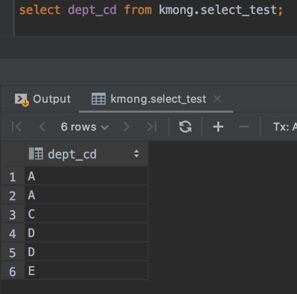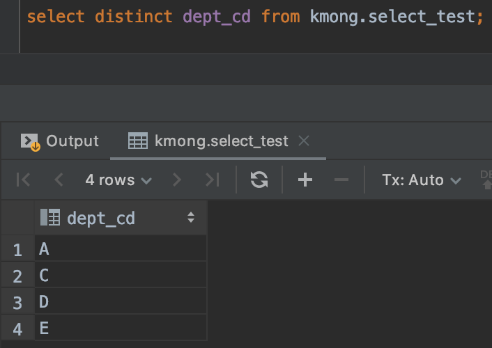kmong.select_test 테이블에서 dept_cd 칼럼만 출력을 했습니다. dept_cd는 보통 '부서 코드'라고 통칭되는 컬럼명입니다. 만일, 누군가 여기에 있는 부서 코드의 리스트를 보고 싶다면 위와 같이 출력하면 안 되겠죠. A와 D가 중복된 값이 있기 때문입니다.