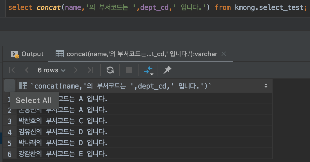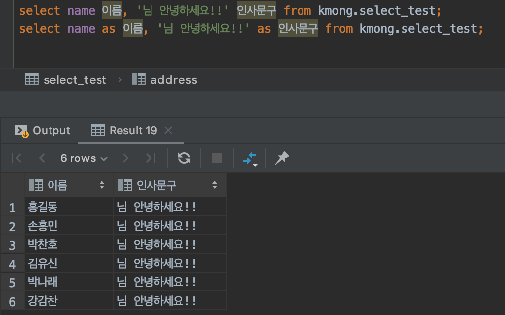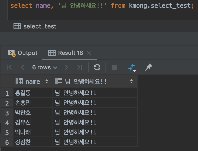 위 SQL을 한번 살펴보겠습니다. from 절에 있는 kmong.select_test라는 테이블에서 name이라는 칼럼만 가지고 와서 출력을 했고, 그 뒤에 '님 안녕하세요!!'라는 문자열을 붙였습니다. 이렇게 실행을 하닌깐 name 칼럼에 있는 6개의 데이터가 다 나오고, 그 우측에 '님 안녕하세요!!'라는 칼럼이 하나 생기면서 모든 이름 옆에 '님 안녕하세요'라는 표현식, 리터럴(literal) 상수 가 출력되고 있는 것을 확인할 수 있습니다. 추후 SQL을 잘 작성하게 되면 업무에 따라서 이 표현식 기능을 유용하게 사용할 수 있습니다.