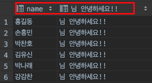 위에서 표현식을 출력한 예문 화면의 컬럼명을 다시 한번 확인해보겠습니다. name, 님 안녕하세요!!라고 칼럼명이 표시되어 있습니다.