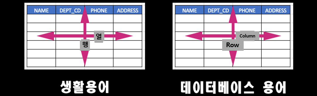 우리의 일상생활에서 표의 구조를 이야기하는 용어와 데이터베이스 테이블의 구조를 이야기할 때 쓰는 용어는 다릅니다. 아래 그림을 보면 이해가 되실 겁니다.