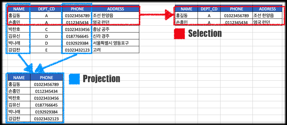 위 테이블에서 Projection , Selection의 방법으로 데이터를 가지고 오면 아래 그림과 같은 결과가 나오게 됩니다.