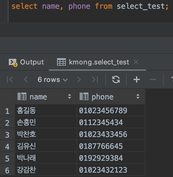 이렇게 명령어를 좀 변경했더니 위 그림처럼 데이터 출력이 바뀌었습니다. select 다음에 * (아스타) 자리에 name, phone이라는 칼럼명이 들어가니 name, phone 칼럼의 데이터만 표시가 됩니다.
