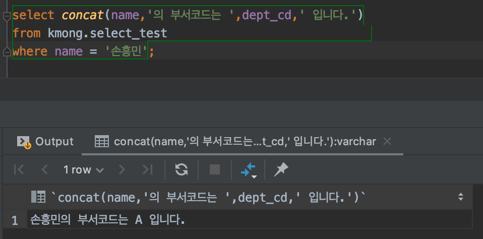 그럼 여기서 마지막으로 '손흥민' 이라는 이름을 가진 사람의 row만 concat 문자열 연결 함수를 사용하여 위와 같이 출력해 볼까요?