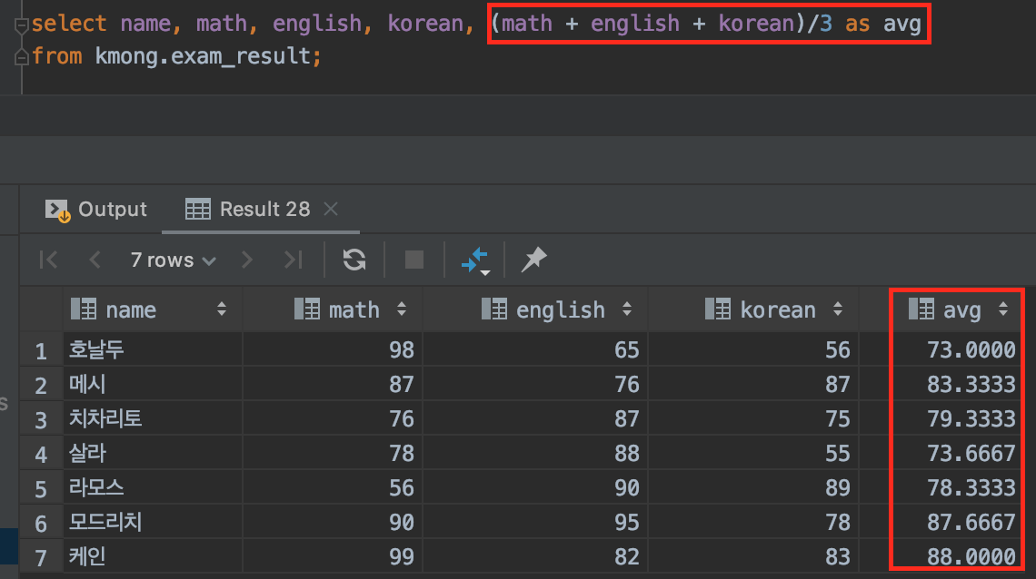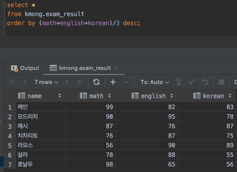 위 그림에서와 같이 출력 값에서는 보이지 않지만 order by (math+english+korean)/3 desc라는 명령을 통해서 평균값이 높은 학생부터 정렬하여 출력이 된 모습을 확인할 수 있습니다.