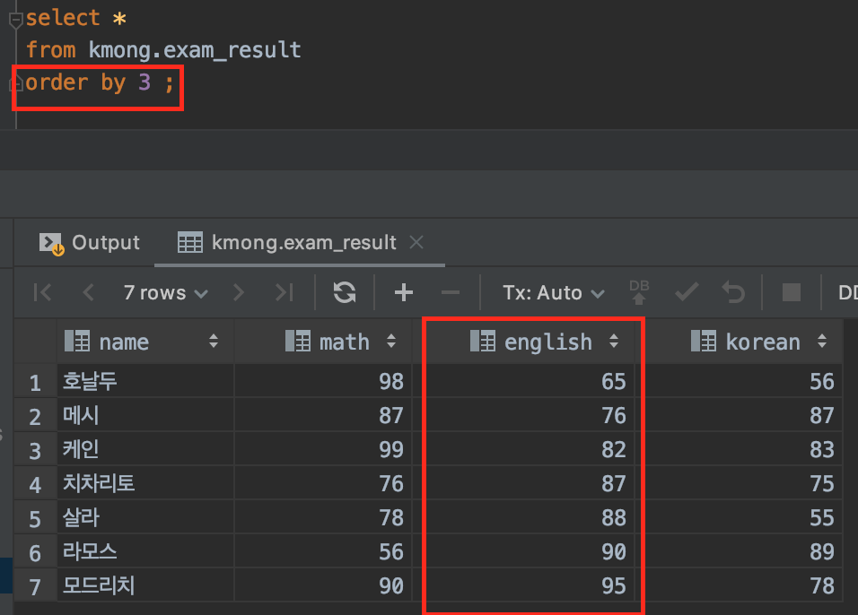 order by 3의 의미는 SQL이 실행한 결과의 세 번째 컬럼을 기준으로 정렬 하라는 뜻 입니다. 그림을 보면 세번째 칼럼인 english 칼럼의 값을 기준으로 오름차순 정렬되어 출력된 결과를 확인하실 수 있습니다.