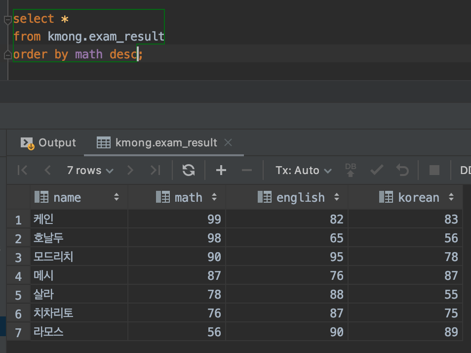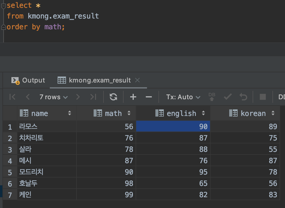 SQL의 마지막에 order by math desc 옵션을 주니 수학 점수가 높은 행부터 정렬된 것을 확인할 수 있습니다.