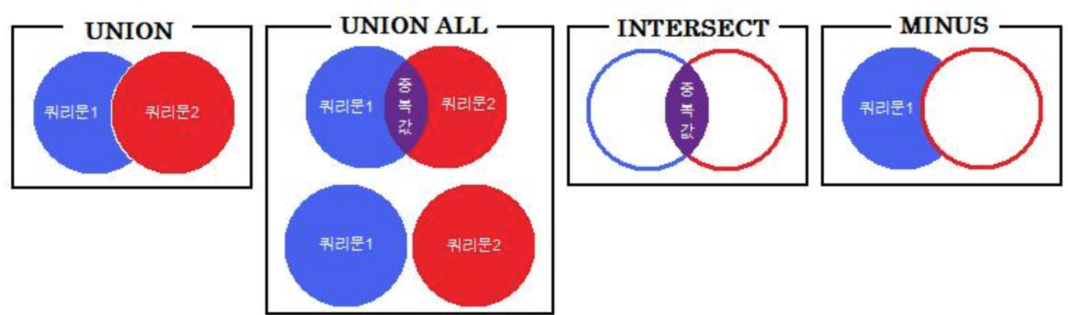 그리고, 집합이라고 하면 데이터베이스에서는 기본적으로 한 테이블을 하나의 집합이라고 하고, SQL에서 하나의 select 문으로 나오는 데이터셋을 집합이라고도 표현합니다. 집합 연산자에 대한 내용 확인해보겠습니다.