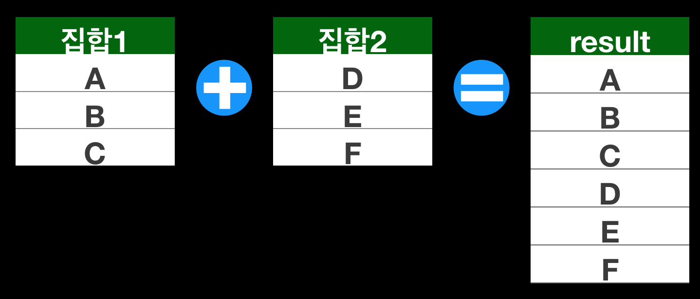 두 집합을 더해서 결과를 출력한다. 중복 제거와 정렬을 하지 않는다. |