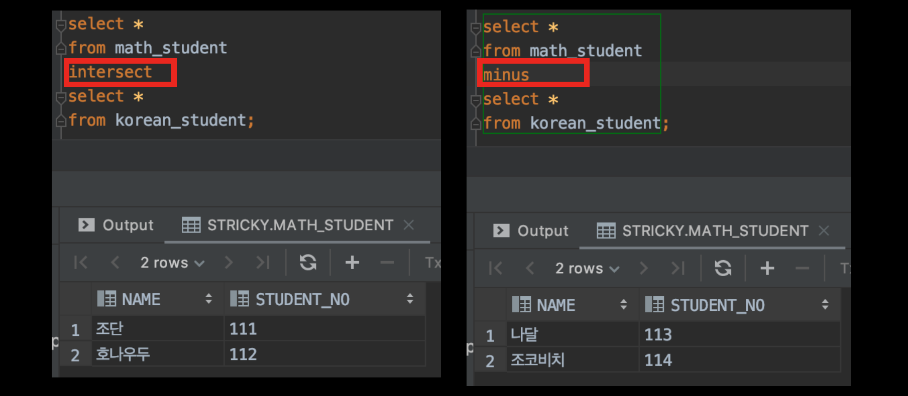두 집합의 차집합 결과를 령렬하고 출력한다. SQL의 순서가 중요하다. |