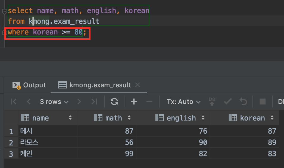 where절에 korean >= 80이라는 조건을 주니 아래와 같이 korean이 80점 이상인 메시와 라모스, 케인이 출력되었습니다.