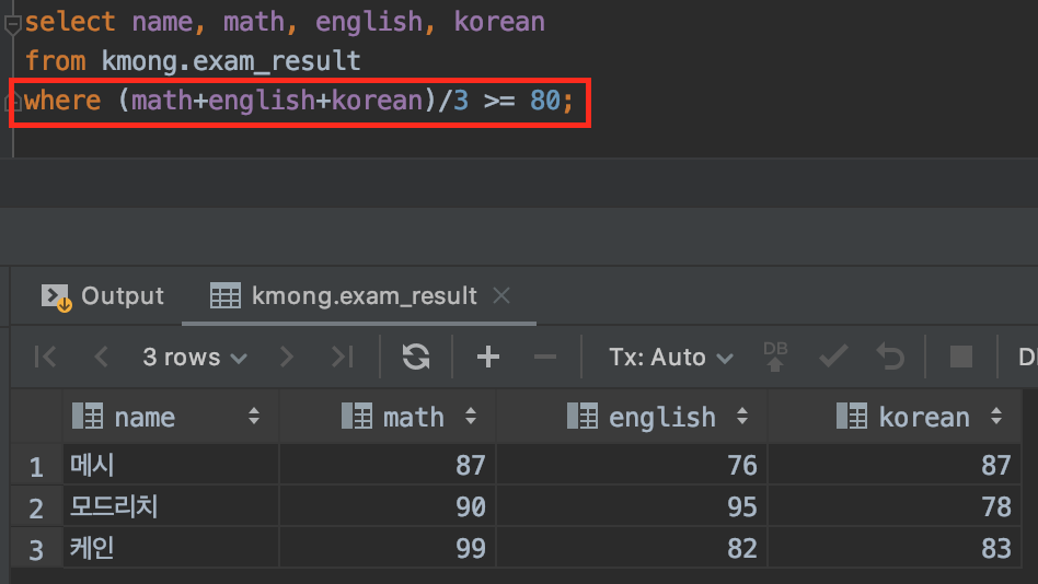where (math+english+korean)/3 >= 80;