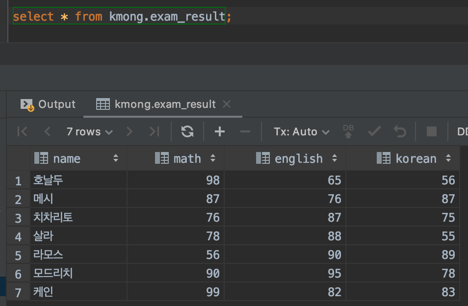 칼럼을 우선 확인해보면, name이 있습니다. 그 옆으로 math, english, korean이라는 과목명이 칼럼명으로 되어 있습니다. 아래에는 사람 이름과 해당 과목들의 점수가 있습니다.
