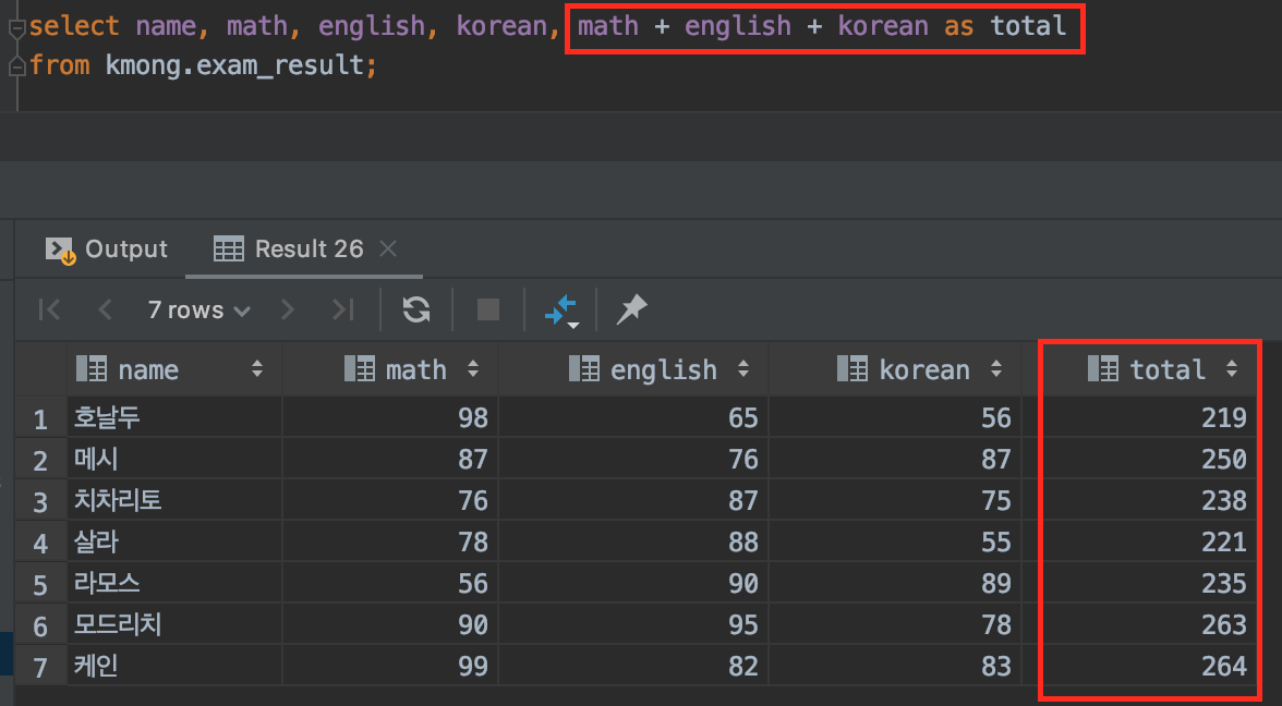 그리고 math + english + korean 부분을 보면 산술 연산자인 + 를 사용해서 각 시험 점수를 더한다라는 명령을 한 겁니다. 다시 말하면 각 시험 점수를 (math + english + korean) 더해서 total이라는 별칭으로 SQL을 실행하라는 이야기입니다.